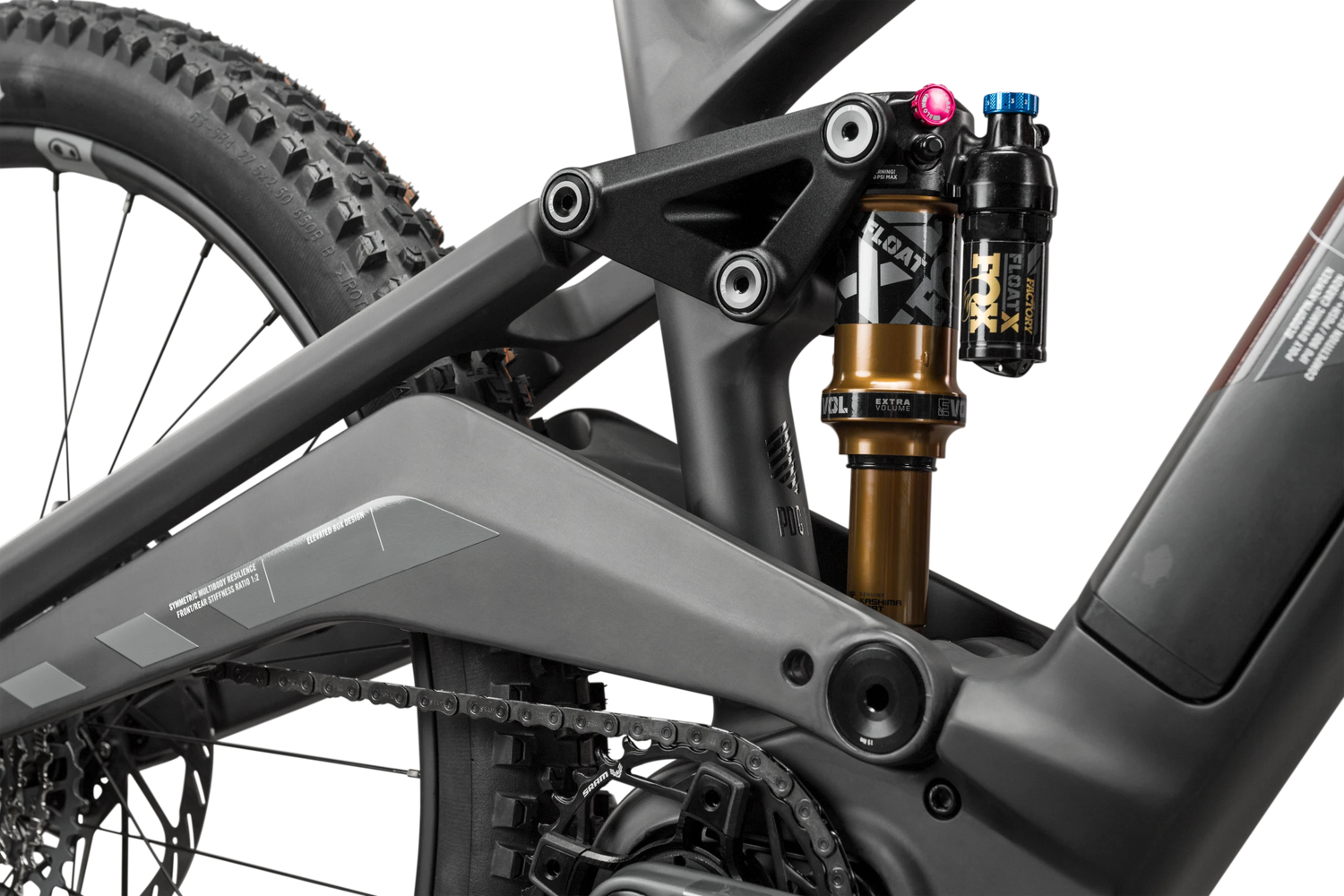 Combining the advantages of a classic four-link rear triangle with those of a high-pivot setup whilst maintain chainstay length through the suspensions action. With optimized anti-rise and anti-squat values the result is a very active 150 mm chassis with stable suspension travel.