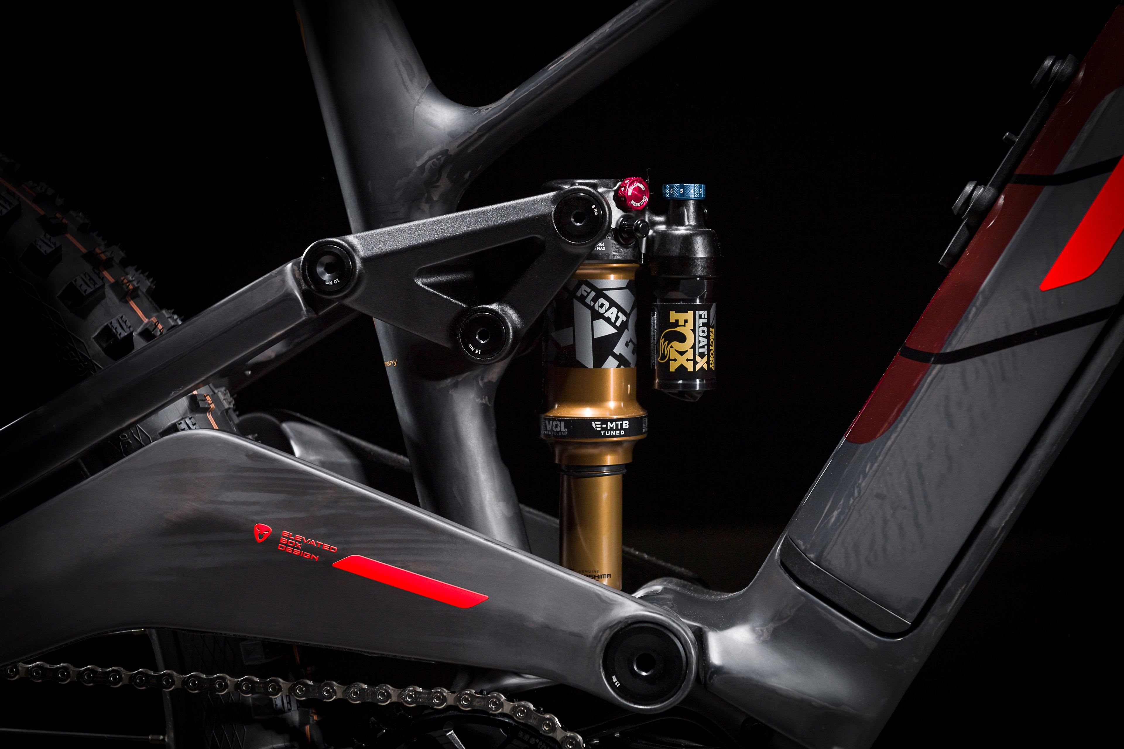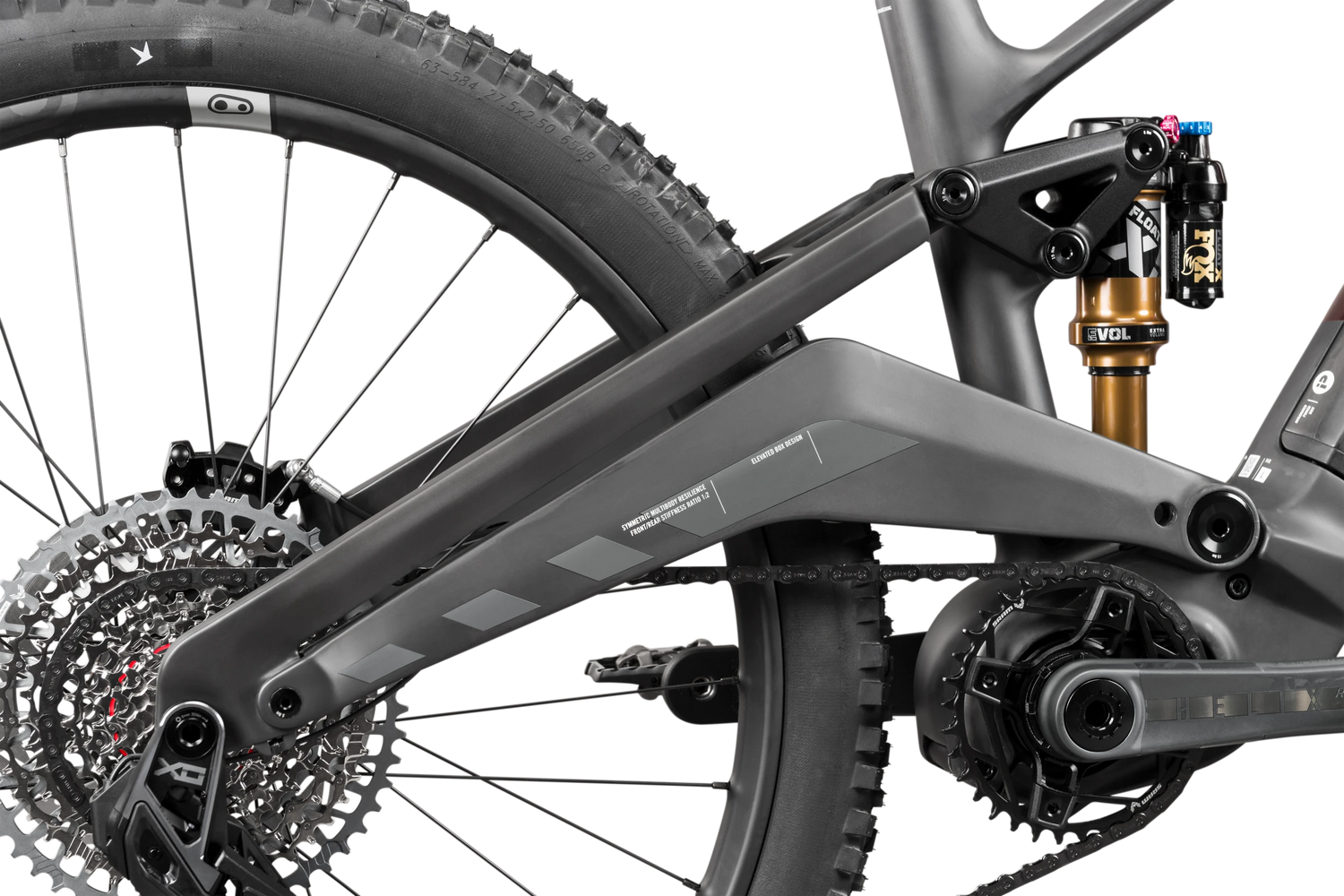 The huge carbon swingarm on the REX .ensures symmetrical stiffness performance. The crossbar between the two chainstays also moves upwards, giving the rear wheel plenty of tire clearance. In addition, chain slap is a thing of the past! This thing is quiet!